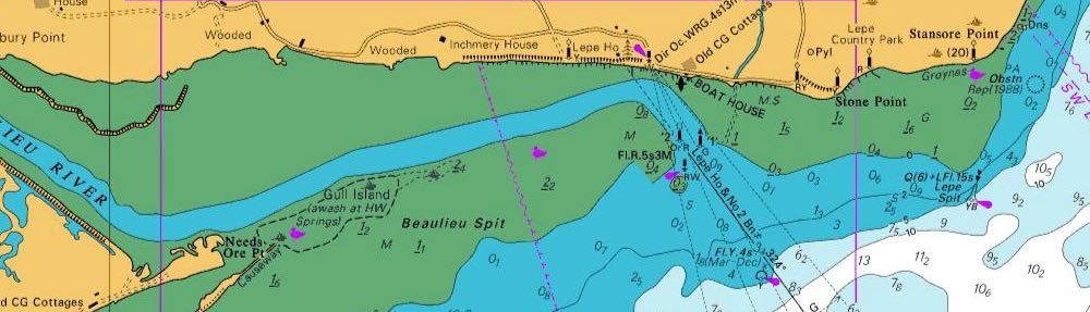 Leave Warsash 5 hours before high water. Sail out of the Hamble and cross over to Calshot. Sail around Calshot Spit. Head west keeping close inshore as far as Lepe spit. which dries but by the time you get there should have covered. Tide turns fair I hour before high water and runs for 6 hours.