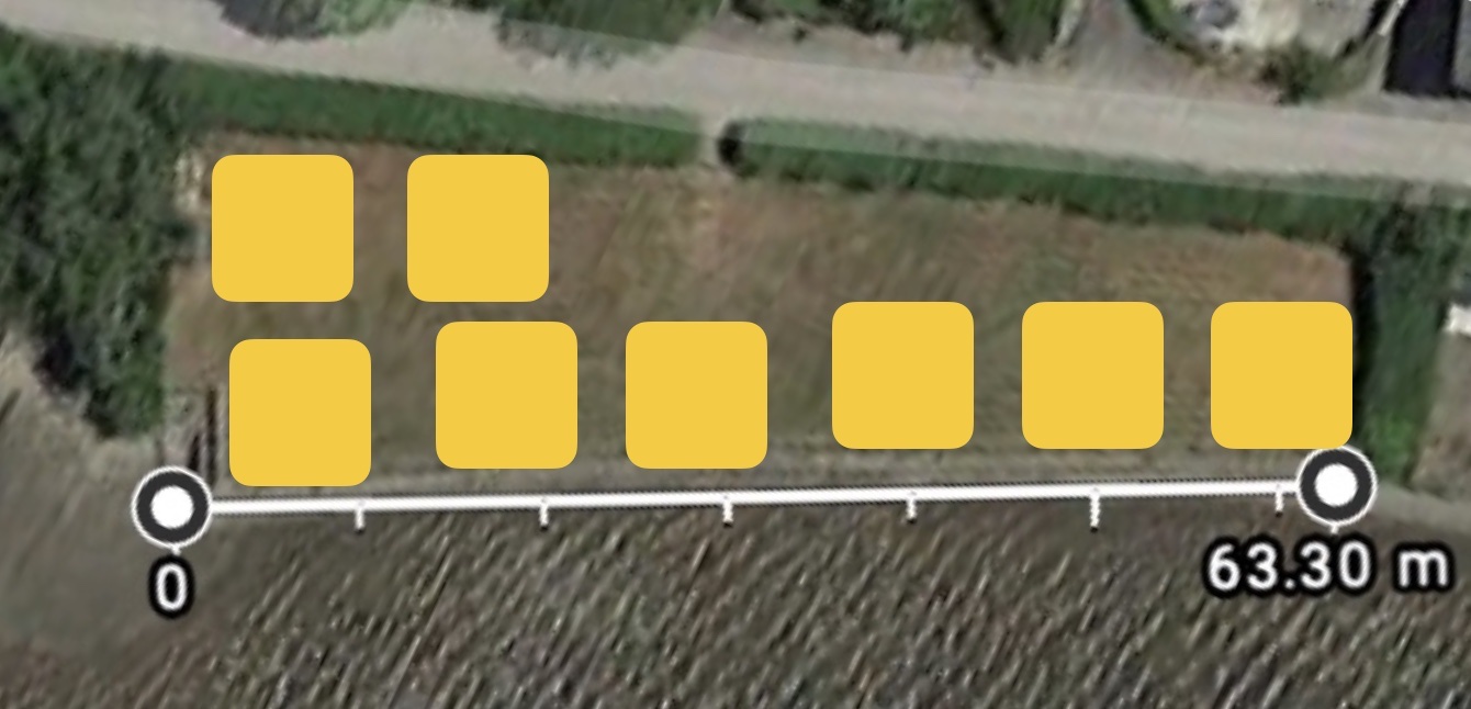 The field is 63m long and 10m at the narrow end, 14m at the wider end and we know that we can fit 8 tent units into this space while maintaining sufficient distance between the units for safety.