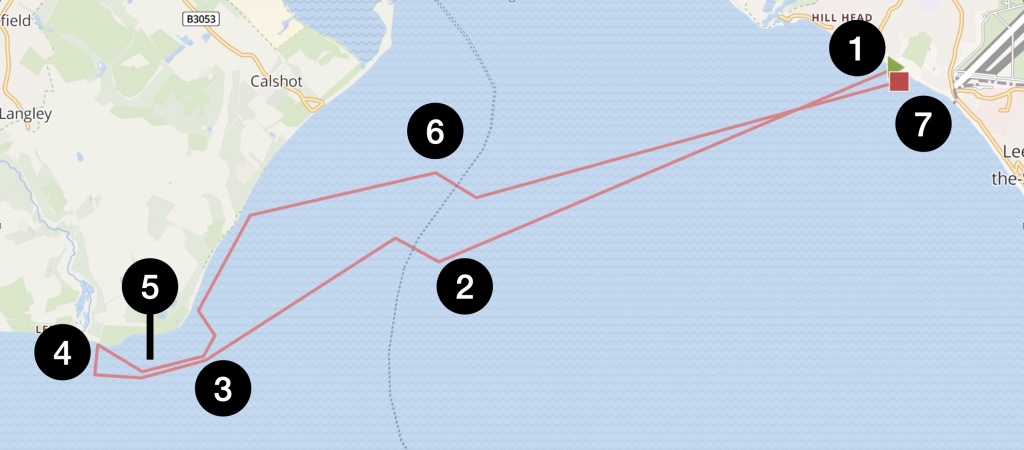 (5) If high tide is a lunchtime, then you’ll be leaving Lepe at mid-Spring ebb, and the tide will be strongly against you, so you need enough wind to overcome the ebb. A long spit sticks out of the shore, and the tide rips past it, so sail in as shallow water as you can to sneak over it and into slower-flowing waters. Stick close to the shore until halfway to Calshot, then turn for Seafarers SC and the tide will be mostly with you all for the rest of the way.