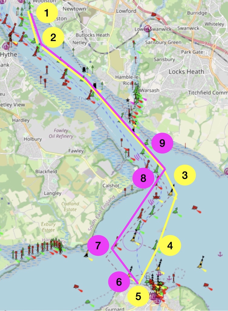 We cross three times, once between the Bramble Bank and cross at the entrance to Cowes, once the less used Western Passage from Gurnerd to North of Lepe, and then finally back to the North side of Southampton Water at Calshot. All crossing locations have good visibility.